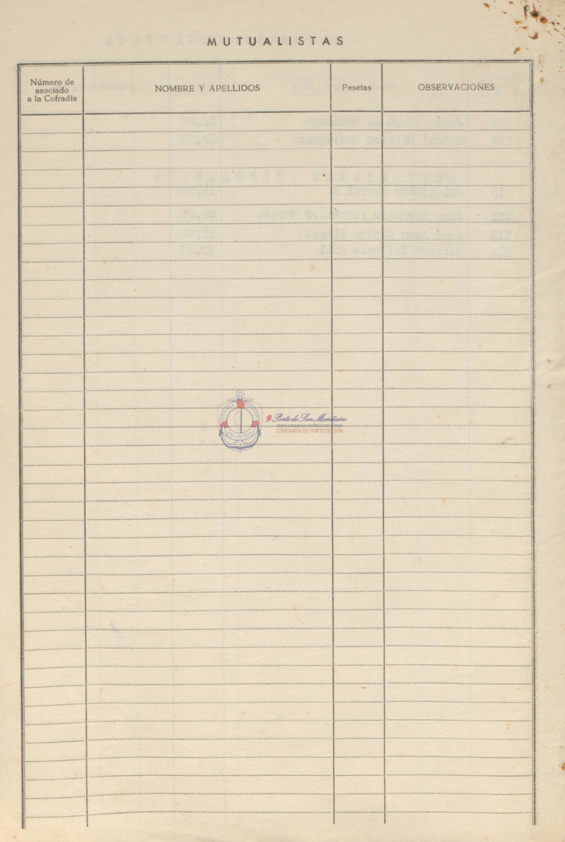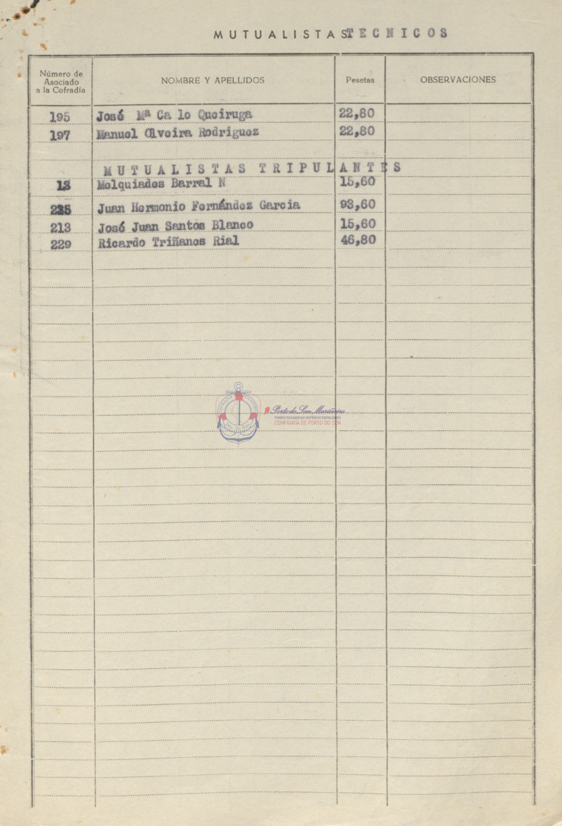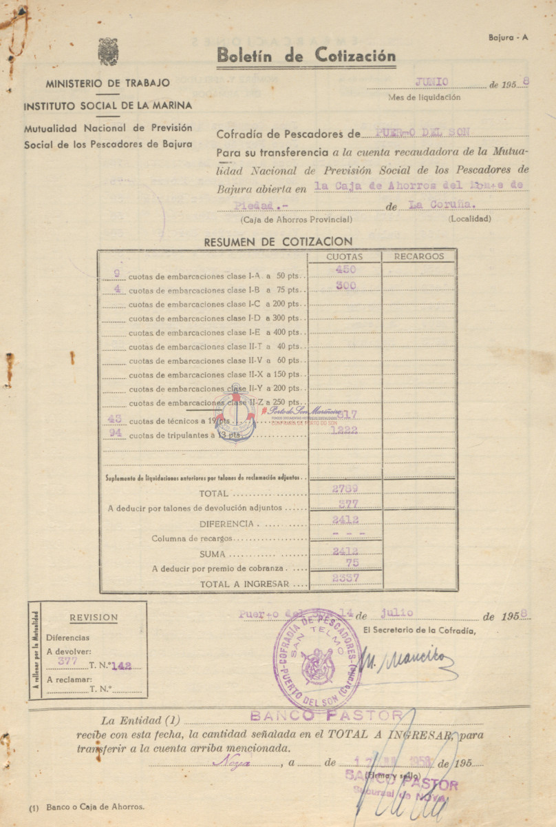 Relacións das cuotas ingresadas correspondentes ao mes de xuño do ano 1958, que corresponden aos mutualistas tripulantes, mariñeiros, técnicos e embarcacións da mutualidade Nacional de Previsión Social dos Pescadores de Baixura