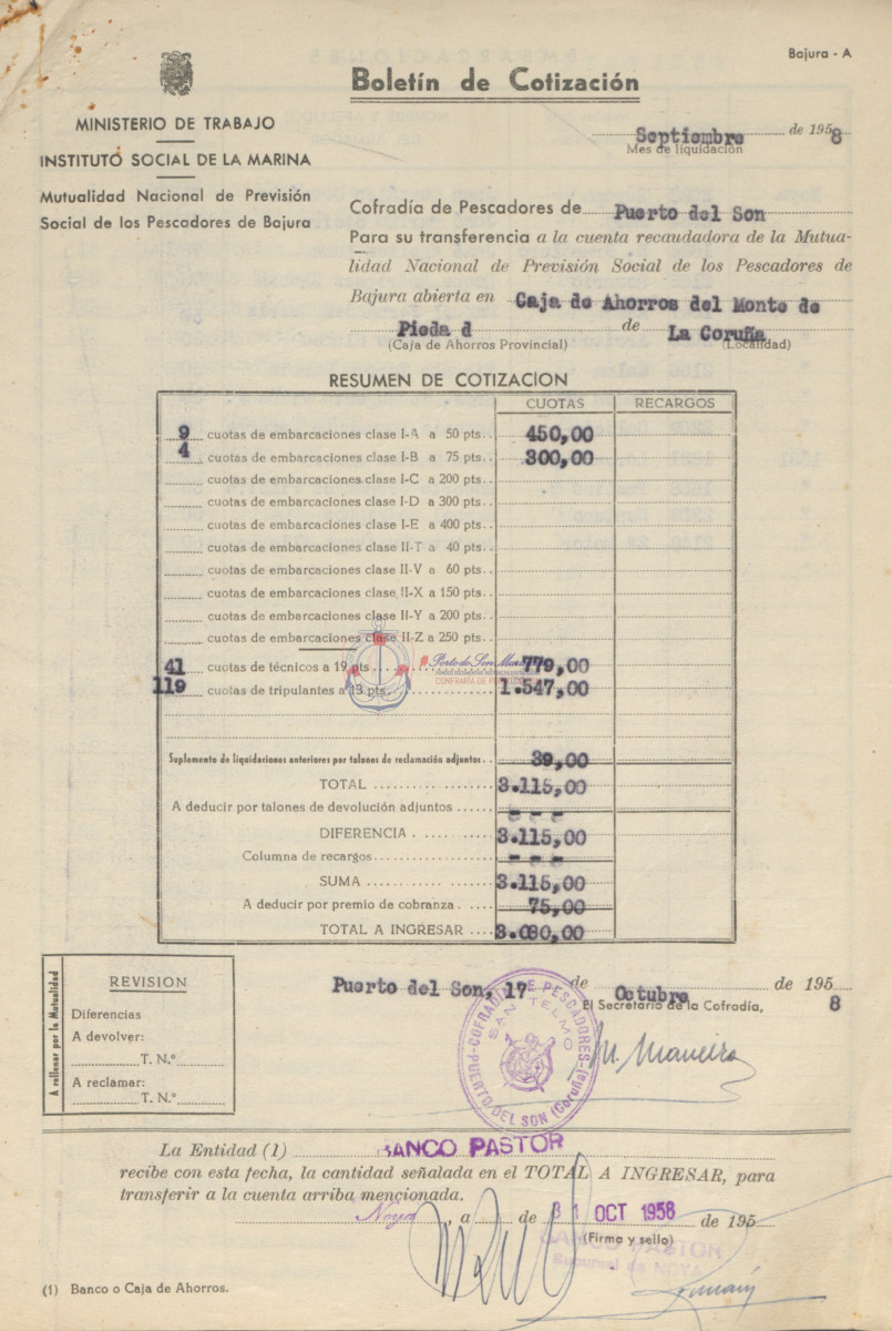Relacións das cuotas ingresadas correspondentes ao mes de setembro do ano 1958, que corresponden aos mutualistas tripulantes, mariñeiros, técnicos e embarcacións da Mutualidade Nacional de Previsión Social dos Pescadores de Baixura