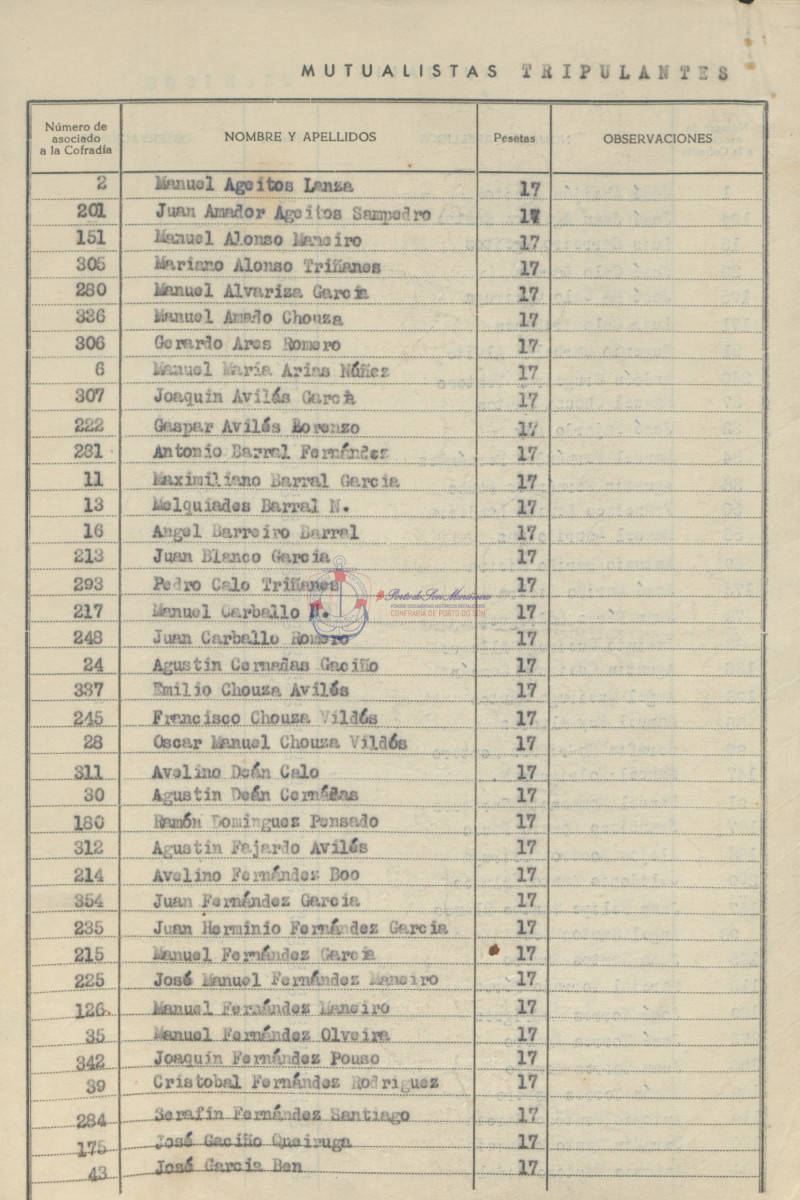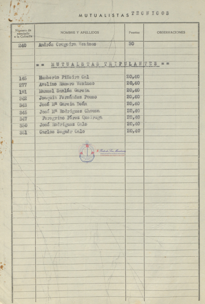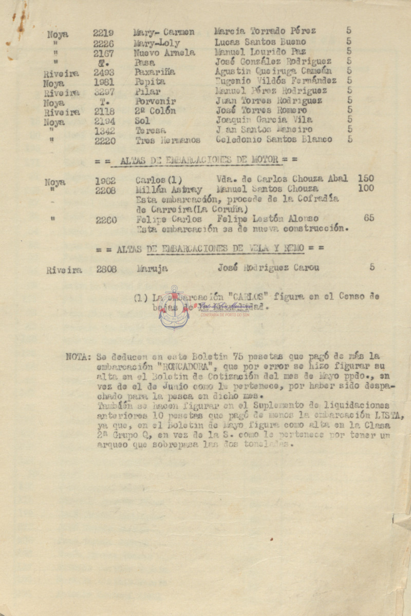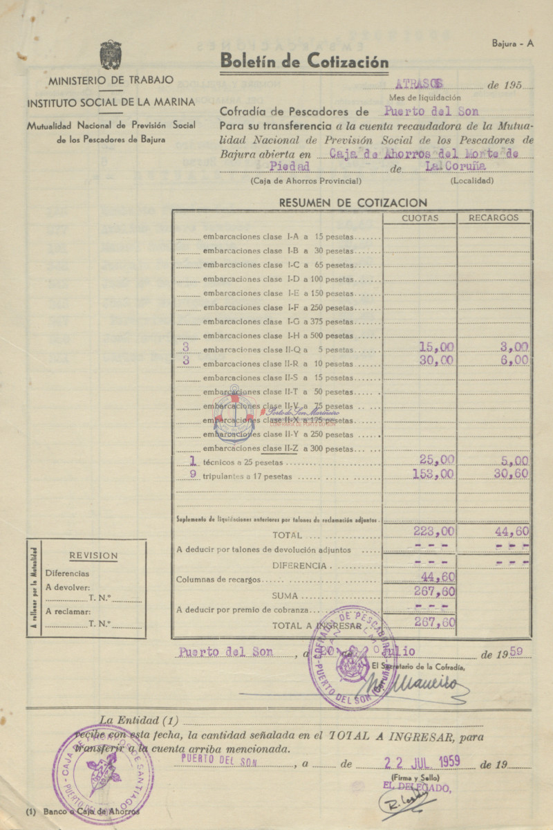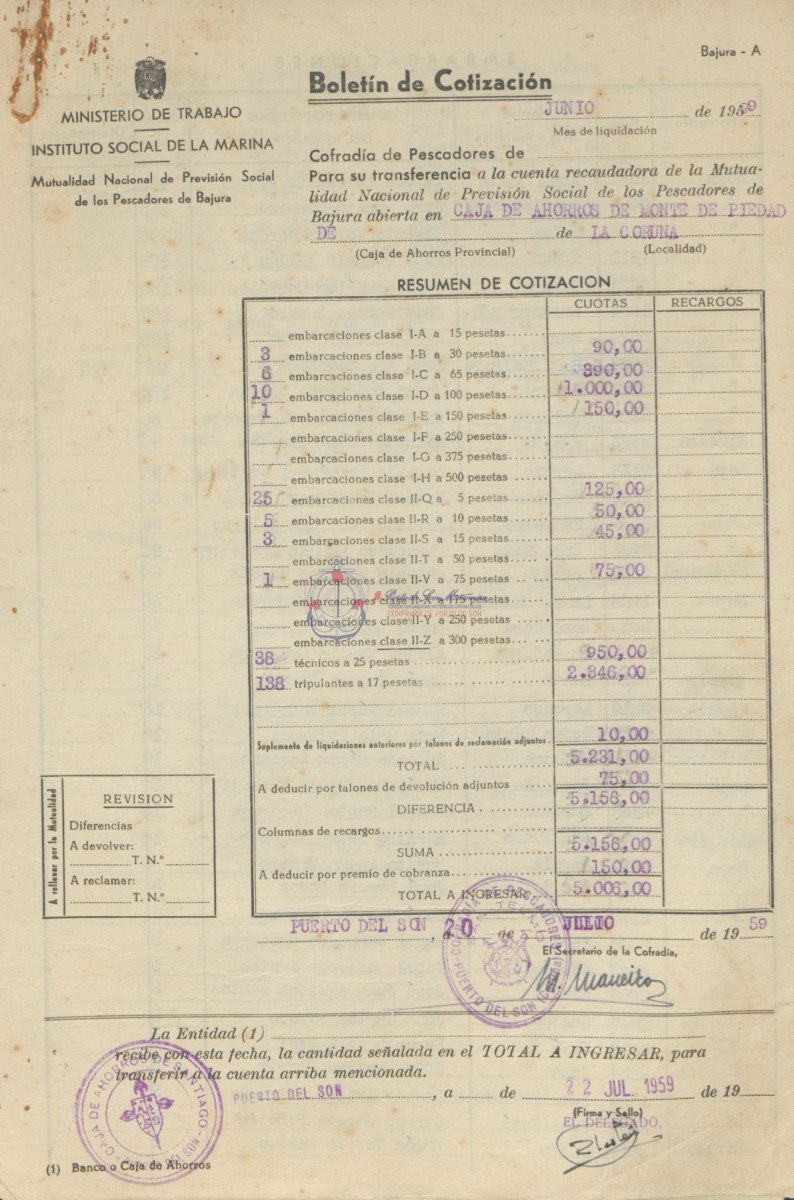 Relacións das cuotas ingresadas correspondentes ao mes de xuño do ano 1959, que corresponden aos mutualistas tripulantes, mariñeiros, técnicos e embarcacións da Mutualidade Nacional de Previsión Social dos Pescadores de Baixura
