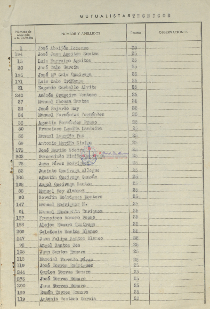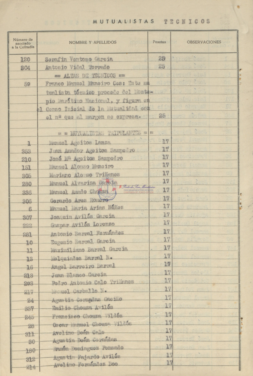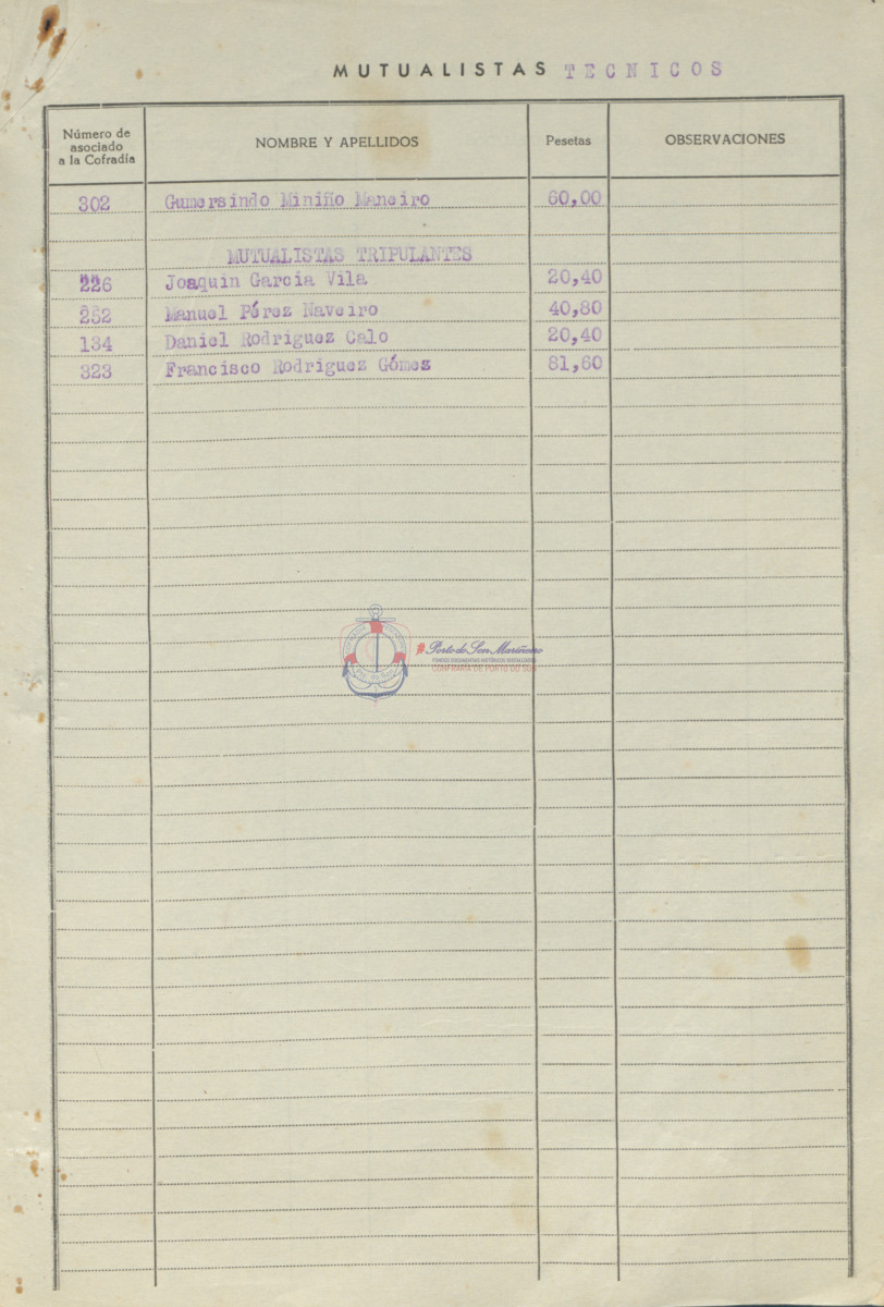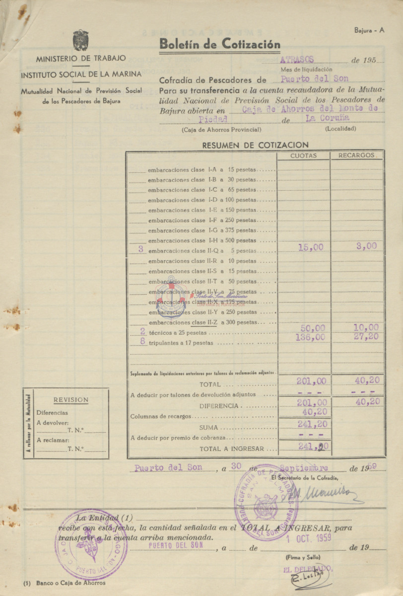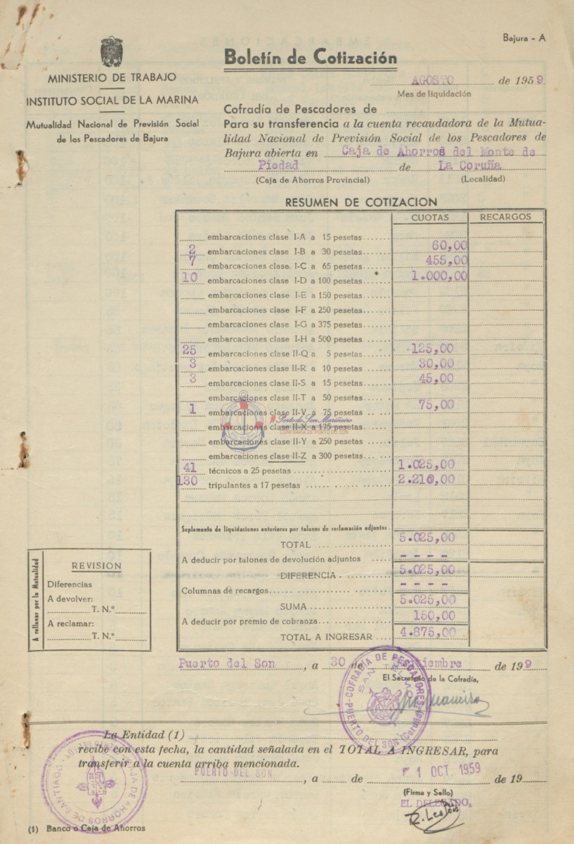 Relacións das cuotas ingresadas correspondentes ao mes de agosto do ano 1959, que corresponden aos mutualistas tripulantes, mariñeiros, técnicos e embarcacións da Mutualidade Nacional de Previsión Social dos Pescadores de Baixura