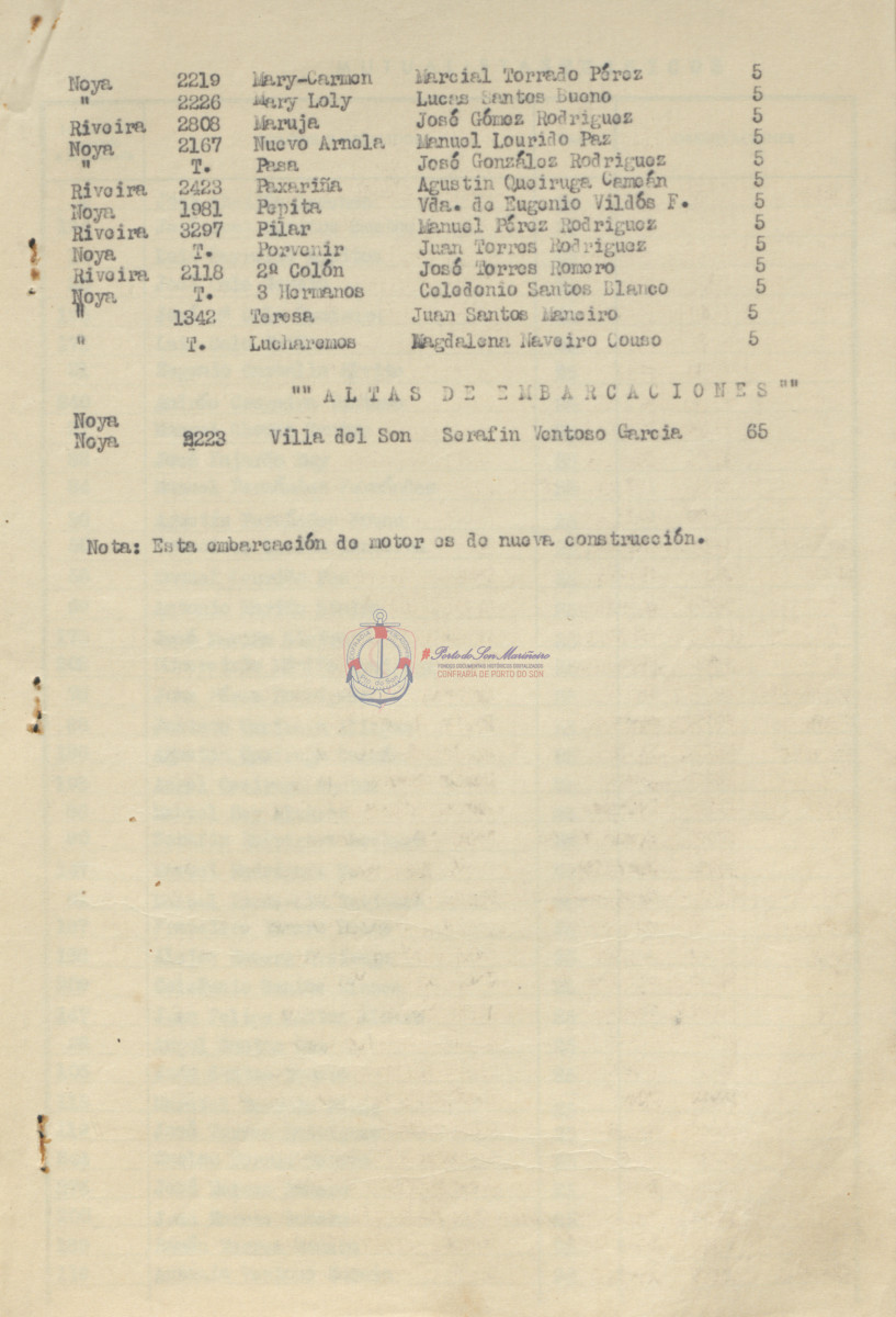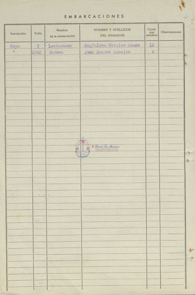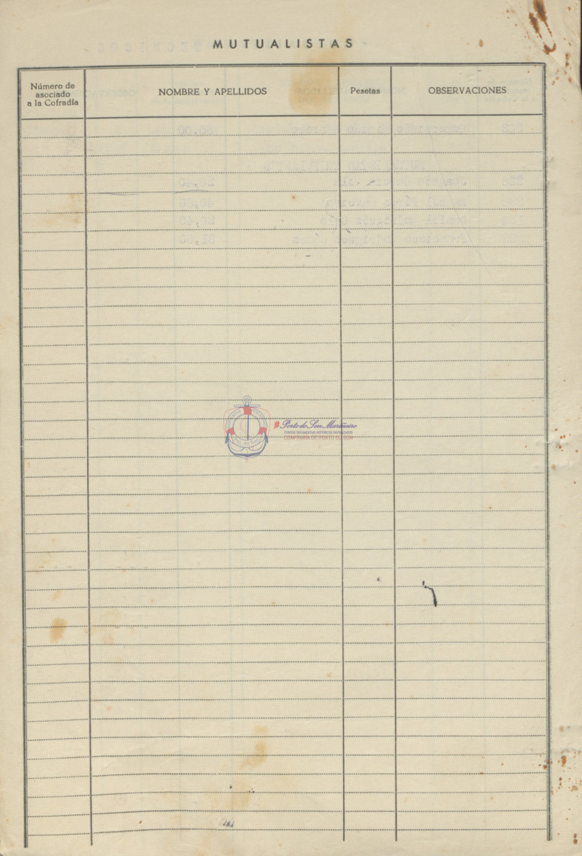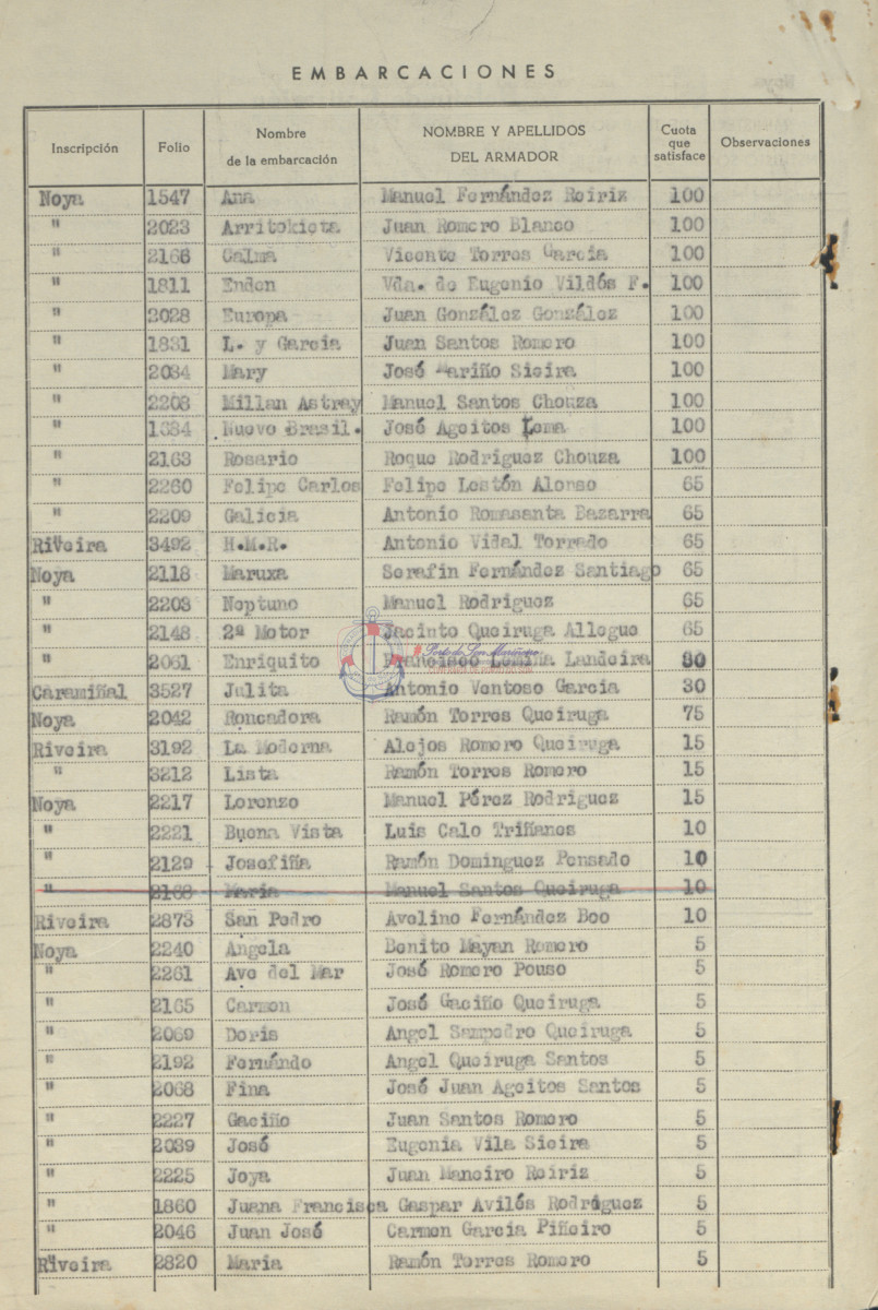 Relacións das cuotas ingresadas correspondentes ao mes de agosto do ano 1959, que corresponden aos mutualistas tripulantes, mariñeiros, técnicos e embarcacións da Mutualidade Nacional de Previsión Social dos Pescadores de Baixura