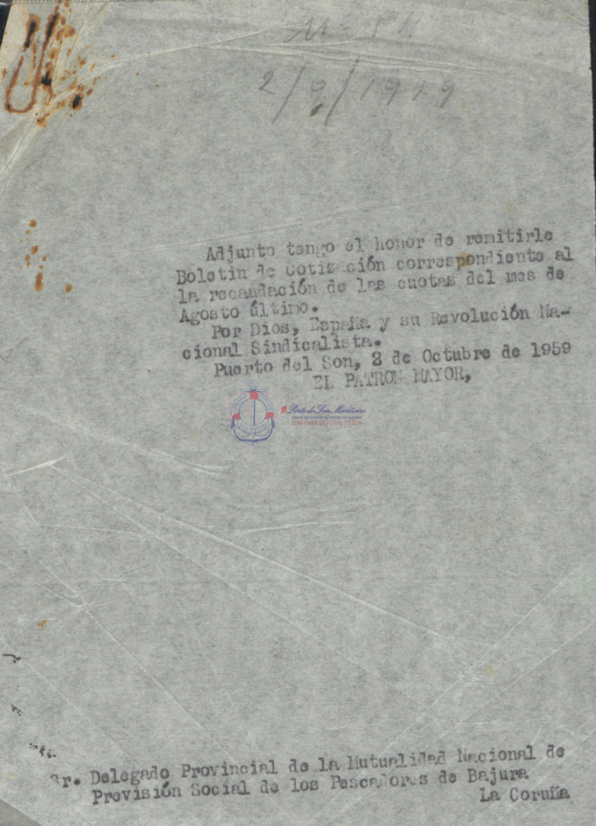 Boletíns de cotización á Mutualidade Nacional de Previsión Social de Pescadores de Baixura 1959: Agosto