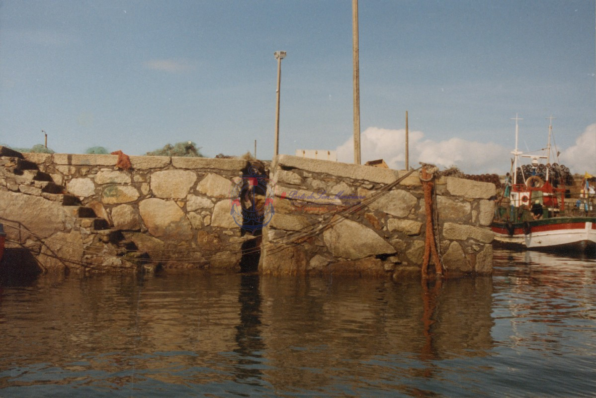 Vista en detalle dos danos causados polo temporal de marzo de 1989 nun muro de contención do peirao de Porto do Son