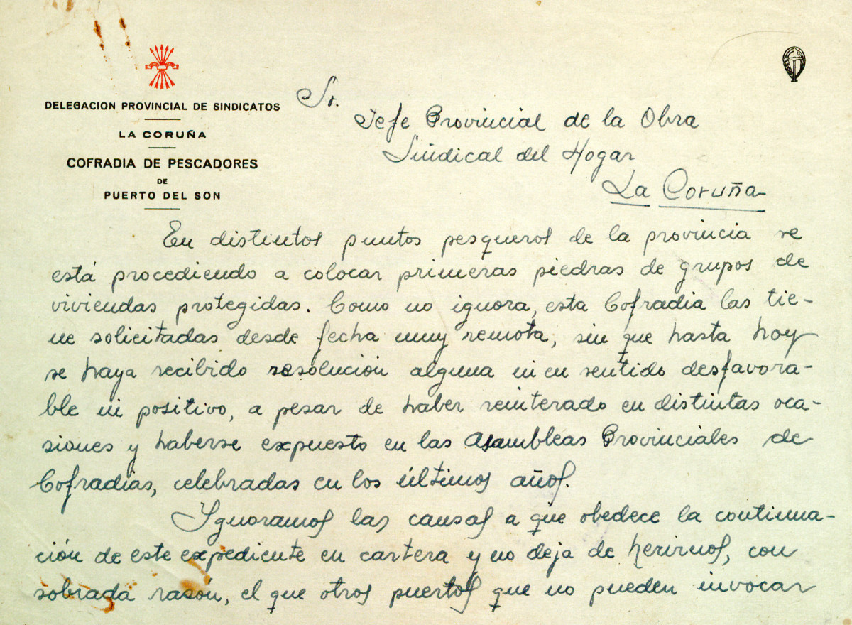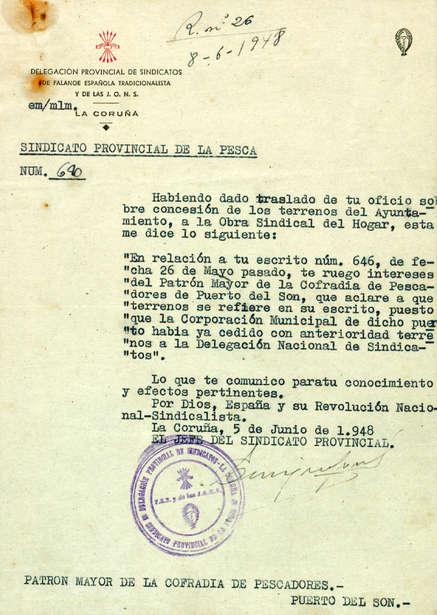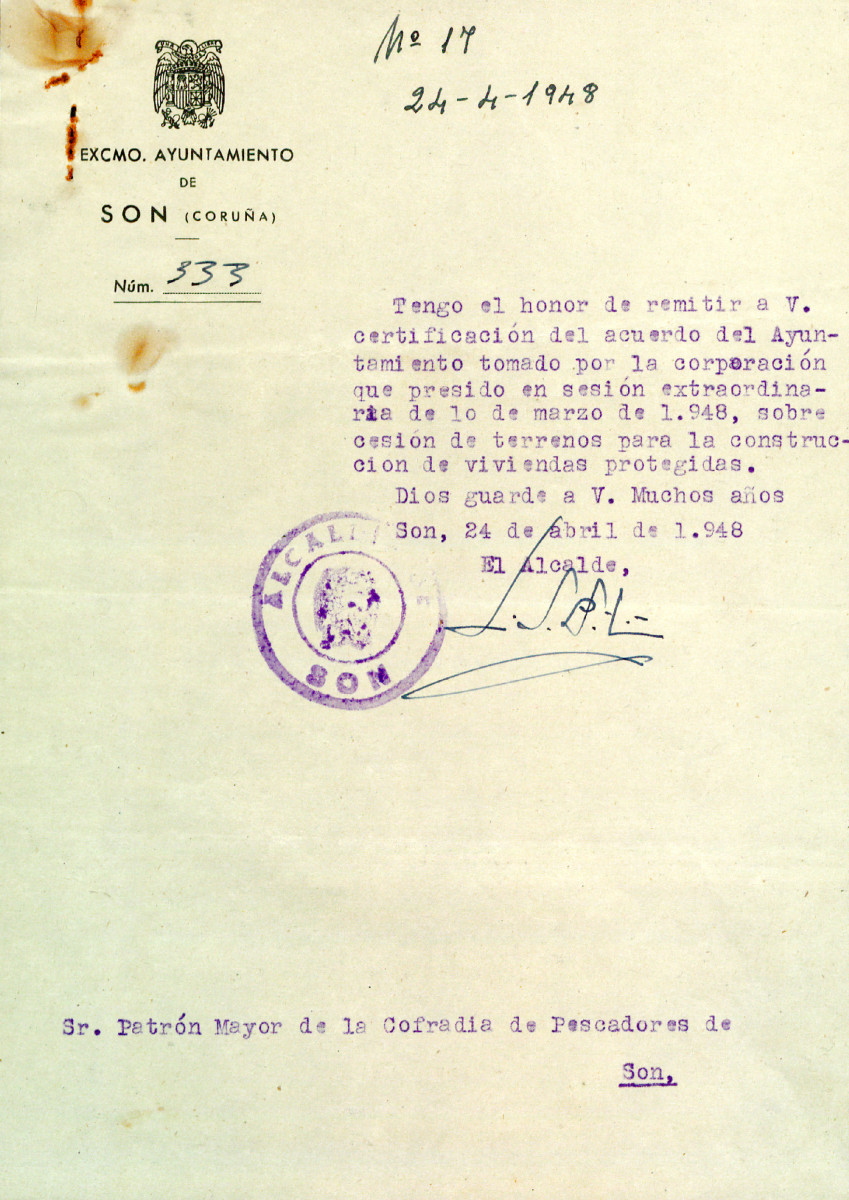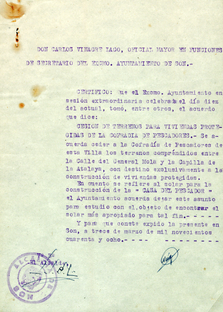 Cesión de terreos por parte do Concello de Porto do Son para a realización do proxecto de obra de vivendas protexidas para pescadores nos terreos comprendidos entre a rúa Xeneral Mola e a Capilla da Atalaya (1948)