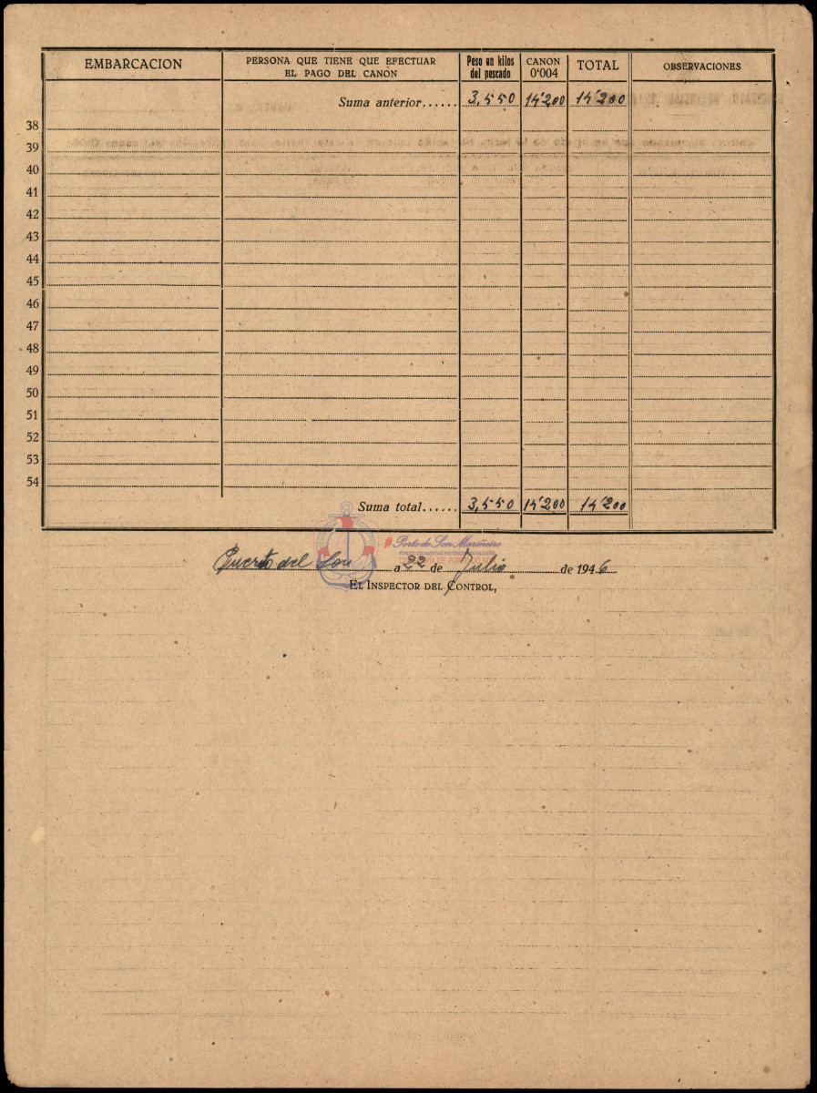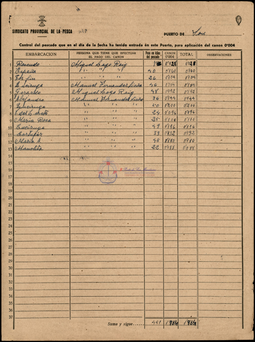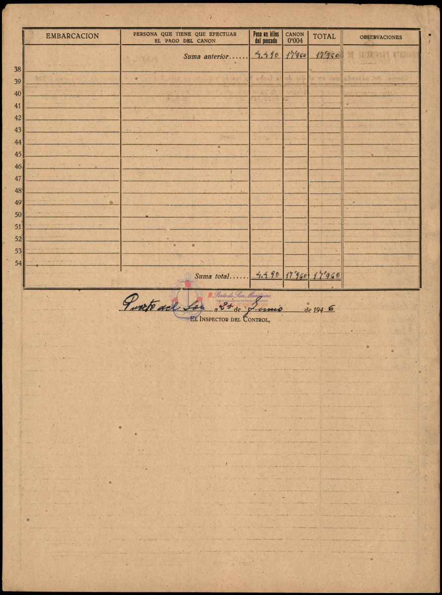 Control diario de pescado que entrou no porto para a aplicación do canon 0,004 do mes de xuño